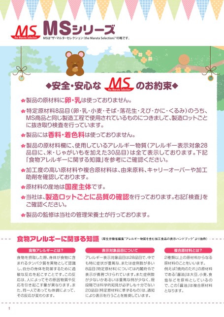 MSシリーズMSは“ザ・マルタ・セレクション(theMarutaSelection)”の略です。◆安全・安心なのお約束◆★製品の原材料に卵・乳は使っておりません。★特定原材料8品目(卵・乳・小麦・そば・落花生・えび・かに・くるみ)のうち、MS商品と同じ製造工程で使用されているものにつきまして、製造ロットごとに抜き取り検査を行っています。★製品には香料・着色料は使っておりません。★製品の原材料欄に、使用しているアレルギー物質(アレルギー表示対象28品目に、米・じゃがいもを加えた30品目)は全て表示しております。下記「食物アレルギーに関する知識」を参考にご確認ください。★加工度の高い原材料や複合原材料は、由来原料、キャリーオーバーや加工助剤を確認しております。★原材料の産地は国産主体です。★当社は、製造ロットごとに品質の確認を行っております。右記「検査」をご確認ください。★製品の監修は当社の管理栄養士が行っております。食物アレルギーに関する知識(厚生労働省編集“アレルギー物質を含む加工食品の表示ハンドブック”より抜粋)食物アレルギーとは?表示対象品目について複合原材料とは?食物を摂取した際、身体が食物に含まれるタンパク質を異物として認識し、自分の身体を防御するために過敏な反応を起こすことです。この反応は、人によってその原因物質や反応を引き起こす量が異なります。また、同一人であっても体調によって、その反応が変わります。アレルギー表示対象品目は28品目で、中でも特に症状が重篤な、または症例数が多い8品目(特定原材料)については内閣府令で表示が義務づけられています。また症例数が少ないかあるいは重篤な例が少なく、現段階では科学的知見が必ずしも十分でない20品目(特定原材料に準ずるもの)は、通知により表示を行うことを推奨しています。2種類以上の原材料からなる原材料のことをいいます。例えば「焼肉のたれ」の原材料である「醤油」は大豆、小麦、食塩などを原料としているので、この「醤油」は複合原材料となります。1