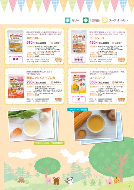 ゼリー4連商品スープ・レトルトアレルギー物質りんご国産の野菜と果物を使った、素材の甘みがほど良い辛さひかえめやさいカレーです。具は食べやすいひとくちサイズ!やさいカレー510円(税込551円)2歳頃〜にんじん、りんご)、食用なたね油、でん粉(じゃがいも)、砂糖(てんさい(国産))、トマトピューレ、食塩、カレー粉、酵母エキス使用原材料:野菜・果実(じゃがいも(国産)、玉ねぎ、内容量:150g梱包:12袋賞味期間:1年商品サイズ/重量:110×160×20mm/160g最終加工地:広島県ITFコード14962311060421JANコード4962311060424商品番号045114動物性素材を使わずに、あっさりしたうまみを出しました。野菜コンソメスープの素290円(税込313円)2歳頃〜使用原材料:食塩(海水(国産))、デキストリン、砂糖(てんさい(国産))、酵母エキス、玉ねぎ粉末、香辛料、にんにく粉末、セロリ粉末内容量:30g(3g×10袋)梱包:12袋賞味期間:6ヶ月商品サイズ/重量:130×190×20mm/40g最終加工地:愛知県ITFコード14962311070338JANコード4962311070331商品番号045173アレルギー物質豚肉りんごアレルギー物質コーンスープ調理例野菜コンソメスープの素調理例国内産の野菜と果物を使ったミートソースです。まろやかな味わいは大人にも子供にもおいしくお召し上がりいただけます。ミートソース430円(税込464円)2歳頃〜トマトピューレ、豚肉、食用なたね油、でん粉(じゃがいも)、砂糖(てんさい(国産))、食塩、酵母エキス、香辛料使用原材料:野菜・果実(玉ねぎ(国産)、にんじん、りんご)、内容量:140g梱包:12袋賞味期間:1年商品サイズ/重量:110×160×15mm/150g最終加工地:広島県ITFコードJANコード496231107012614962311070123商品番号045164コーンの甘みと香りが楽しめる、すっきりとした味のスープです。北海道産のスイートコーンを使っています。コーンスープ350円(税込378円)1歳半頃〜デキストリン、食塩、野菜エキス使用原材料:スイートコーン(国産)、でん粉(じゃがいも)、内容量:48g(12g×4袋)梱包:12袋賞味期間:1年商品サイズ/重量:130×190×20mm/60g最終加工地:愛知県(白菜、デキストリン、食塩)、酵母エキスITFコード14962311060445JANコード4962311060448商品番号0451136