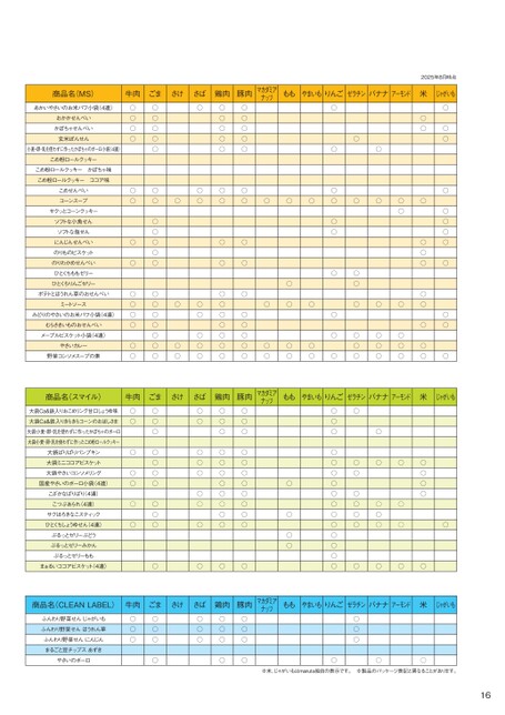 商品名(MS)牛肉ごまさけさば鶏肉豚肉マカダミアナッツももやまいもりんごゼラチンバナナアーモンド米じゃがいも2025年8月時点あかいやさいのお米パフ小袋(4連)おかかせんべいかぼちゃせんべい玄米ぽんせん小麦・卵・乳を使わずに作ったかぼちゃのボーロ小袋(4連)こめ粉ロールクッキーこめ粉ロールクッキーかぼちゃ味こめ粉ロールクッキーココア味こめせんべいコーンスープサクッとコーンクッキーソフトな小魚せんソフトな塩せんにんじんせんべいのりものビスケットのりわかめせんべいひとくちももゼリーひとくちりんごゼリーポテトとほうれん草のおせんべいミートソースみどりのやさいのお米パフ小袋(4連)むらさきいものおせんべいメープルビスケット小袋(4連)やさいカレー野菜コンソメスープの素○○○○○○○○○○○○○○○○○○○○○○○○○○○○○○○○○○○○○○○○○○○○○○○○○○○○○○○○○○○○○○○○○○○○○○○○○○○○○○○○○○○○○○○○○○○○○○○○○○○○○○○○○○○○○○○○○○○○○○○○○○○○○○○○○○○○○○○○○○○○○○商品名(スマイル)牛肉ごまさけさば鶏肉豚肉マカダミアナッツももやまいもりんごゼラチンバナナアーモンド米じゃがいも○○○○○〇○大袋Ca&鉄入りおこめリング甘口しょうゆ味大袋Ca&鉄入りきらきらコーンのおほしさま大袋小麦・卵・乳を使わずに作ったかぼちゃのボーロ大袋小麦・卵・乳を使わずに作ったこめ粉ロールクッキー大袋ぱりぱりパンプキン大袋ミニココアビスケット大袋やさいコンソメリング国産やさいのボーロ小袋(4連)こざかなぱりぱり(4連)こつぶあられ(4連)サクほろきなこスティックひとくちしょうゆせん(4連)ぷるっとゼリーぶどうぷるっとゼリーみかんぷるっとゼリーももまぁるいココアビスケット(4連)○○○○○○○○○○○○○○○○○〇○○○○○○○○○〇○○○○○○○○○○○○○○○○○○○○○○○○○○○○○○○○○○○○〇○○〇○○○〇○○○○○○○○○○○○○○○商品名(CLEANLABEL)牛肉ごまさけさば鶏肉豚肉マカダミアナッツももやまいもりんごゼラチンバナナアーモンド米じゃがいもふんわり野菜せんじゃがいもふんわり野菜せんほうれん草ふんわり野菜せんにんじんまるごと豆チップスあずきやさいのボーロ○○○○○○○○○○○○○○○○○○○○○※米、じゃがいもはmaruta独自の表示です。※製品のパッケージ表記と異なることがあります。○〇〇16