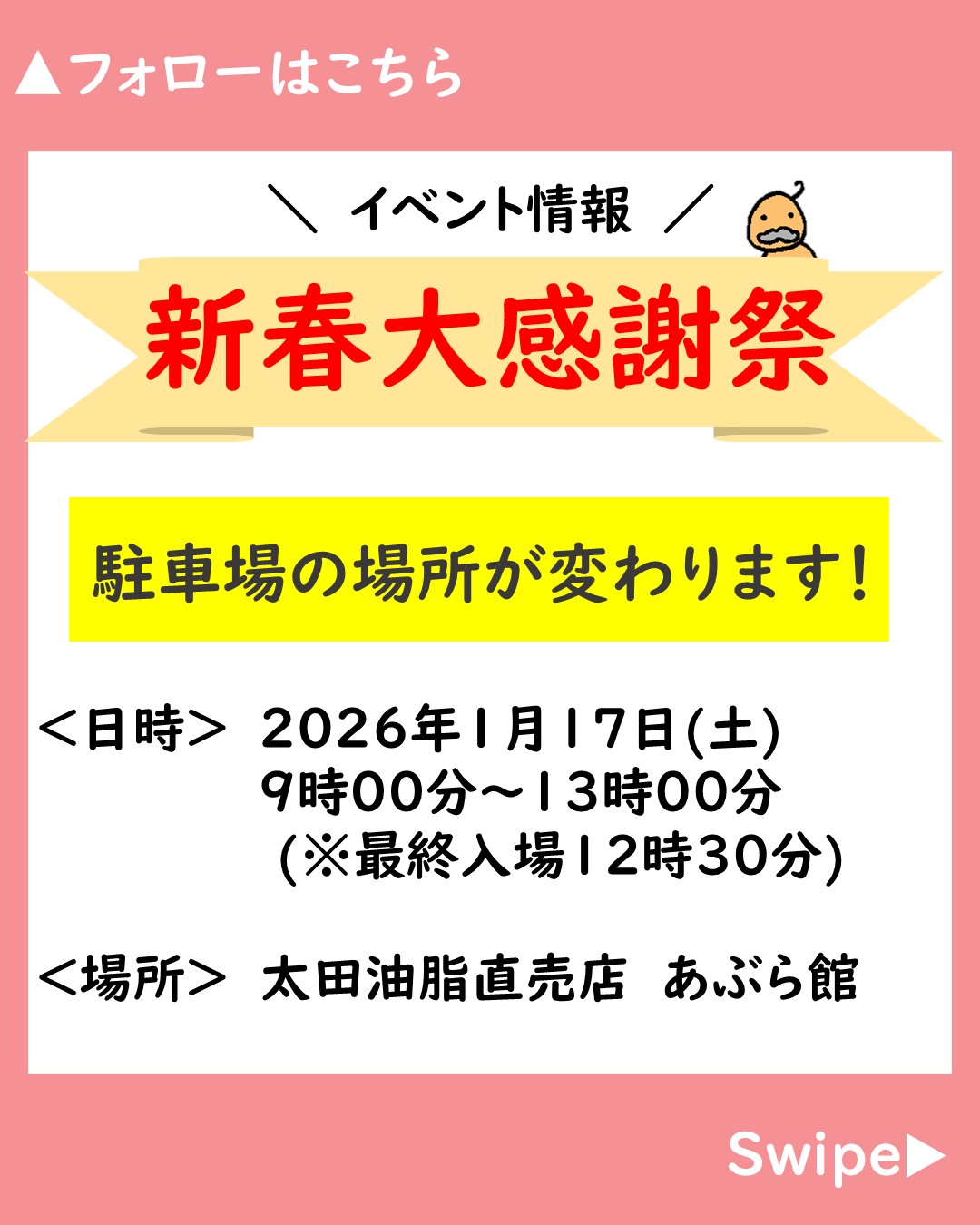 あぶら館(販売店舗)冬季休業期間のお知らせ 平素よりあぶら館(販売店舗)をご利用いただき、誠にありがとうございます。 さて、弊社では冬季休業期間を下記の通りとさせていただきます。 2025年12月26日