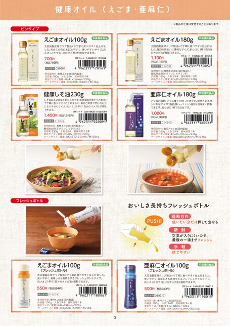 ビンタイプえごまオイル100g栄養機能食品太田油脂圧搾クリア製法Ⓡで丁寧に食べやすく仕上げました。初めての方にも試しやすく、使いやすいサイズ。約小さじ1杯で1日分のオメガ3が摂取できます。700円(税込756円)商品番号039661ITFコード14962311170168使用原材料:食用えごま油(国内製造)内容量:100g商品サイズ/重量:4141158mm/278gケースサイズ/重量:301203184mm/約7.0kg入数:24本賞味期間:1年健康しそ油230g栄養機能食品しそ油はえごま油と同じものです。太田油脂圧搾クリア製法Ⓡで丁寧に食べやすく仕上げました。毎日ご家族で使われる方におすすめのサイズ。約小さじ1杯で1日分のオメガ3が摂取できます。ITFコード02449623110200971,400円(税込1,512円)014043商品番号使用原材料:食用えごま油(国内製造)/酸化防止剤(ビタミンC、ビタミンE)内容量:230g入数:24本賞味期間:1.5年商品サイズ/重量:6060190mm/510gケースサイズ/重量:380270240mm/約12.6kgフレッシュボトルえごまオイル100g(フレッシュボトル)栄養機能食品太田油脂圧搾クリア製法Ⓡで丁寧に食べやすく仕上げました。使いやすく、美味しさも長持ちするフレッシュボトルタイプ。約小さじ1杯で1日分のオメガ3が摂取できます。ITFコード14962311180068550円(税込594円)商品番号014219使用原材料:食用えごま油(国内製造)内容量:100g入数:24本賞味期間:1年商品サイズ/重量:Φ44138mm/120gケースサイズ/重量:304204153mm/約3.3kg3*製品の仕様は変更することがあります。えごまオイル180g栄養機能食品太田油脂圧搾クリア製法Ⓡで丁寧に食べやすく仕上げました。毎日の家使いに便利なサイズ。約小さじ1杯で1日分のオメガ3が摂取できます。ITFコード149623111500541,100円(税込1,188円)014031商品番号使用原材料:食用えごま油(国内製造)/酸化防止剤(ビタミンC、ビタミンE)内容量:180g入数:24本賞味期間:1.5年商品サイズ/重量:4747187mm/419gケースサイズ/重量:302204215mm/約10.5kg亜麻仁オイル180g栄養機能食品アマ科の植物、アマニ種子を搾った油です。現代人に不足しがちなオメガ3脂肪酸(α-リノレン酸)を効率よく摂取できます。約小さじ1杯で1日分です。ITFコード149623111600601,000円(税込1,080円)商品番号014340使用原材料:食用アマニ油(国内製造)内容量:180g商品サイズ/重量:4747187mm/419gケースサイズ/重量:302204215mm/約10.5kg入数:24本賞味期間:1年おいしさ長持ちフレッシュボトルPUSH!調節自在使いたい分だけ押して出せる新鮮空気が入りにくいので、最後の一滴までフレッシュ手軽捨てやすい亜麻仁オイル100g(フレッシュボトル)栄養機能食品太田油脂圧搾クリア製法Ⓡで丁寧に食べやすく仕上げました。使いやすく、美味しさも長持ちするフレッシュボトルタイプ。約小さじ1杯で1日分のオメガ3が摂取できます。500円(税込540円)商品番号039217ITFコード14962311190012使用原材料:食用アマニ油(国内製造)内容量:100g入数:24本商品サイズ/重量:Φ44138mm/120gケースサイズ/重量:304204153mm/約3.3kg賞味期間:9ヶ月