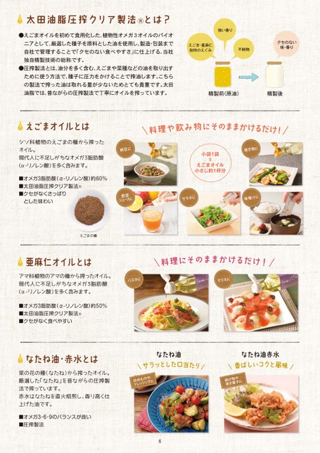 Ⓡシソ科植物のえごまの種から搾ったオイル。現代人に不足しがちなオメガ3脂肪酸(α-リノレン酸)を多く含みます。■オメガ3脂肪酸(α-リノレン酸)約60%■太田油脂圧搾クリア製法Ⓡ■クセがなくさっぱりとした味わい納豆に野菜ジュースにえごまの種アマ科植物のアマの種から搾ったオイル。現代人に不足しがちなオメガ3脂肪酸(α-リノレン酸)を多く含みます。パスタに■オメガ3脂肪酸(α-リノレン酸)約50%■太田油脂圧搾クリア製法Ⓡ■クセがなく食べやすい焼き物に小袋1袋えごまオイル小さじ約1杯分サラダに味噌汁にマリネに炒めものやドレッシングに揚げ物や焼き菓子に菜の花の種(なたね)から搾ったオイル。厳選した「なたね」を昔ながらの圧搾製法で搾っています。赤水はなたねを直火焙煎し、香り高く仕上げた油です。■オメガ3・6・9のバランスが良い■圧搾製法6