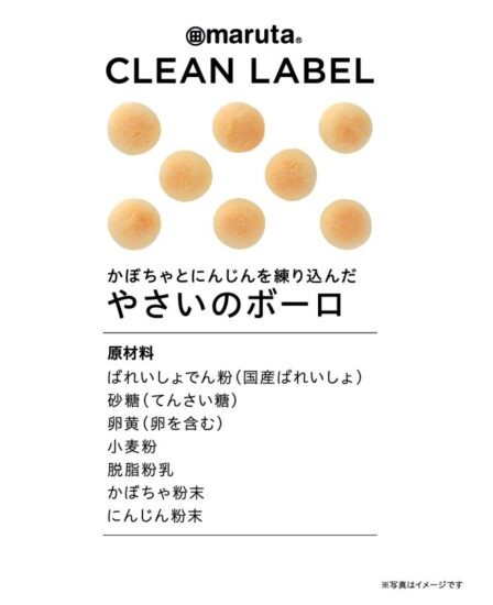 ばれいしょでん粉(ばれいしょ(国産))、砂糖(てんさい糖)、卵黄(卵を含む)、小麦粉、脱脂粉乳、かぼちゃ粉末、にんじん粉末